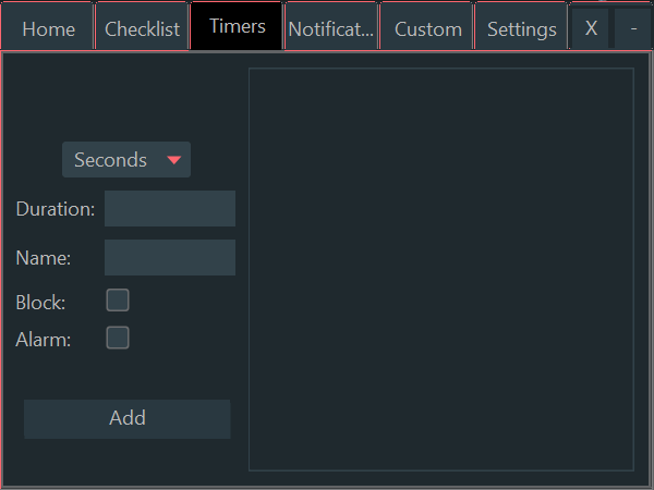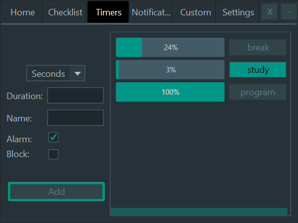The timer tab is used to create short timers with the option to make them an alarm or blocking. An alarm timer will beep 3 times when it is done. A blocking timer will block access to websites set on the block sites tab in settings.